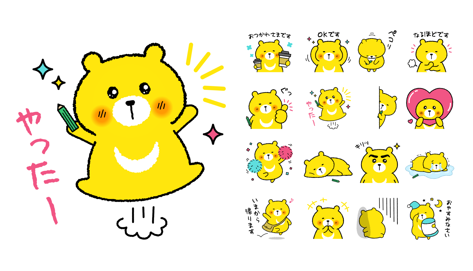 4MOONオリジナルキャラクターの黄色いくま「きろくま」のLINEスタンプは、日常生活で使いやすい「おつかれさまです」「OKです」「ぺこり」など全16種類のバリエーションを展開しています。