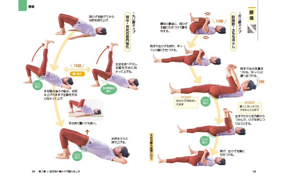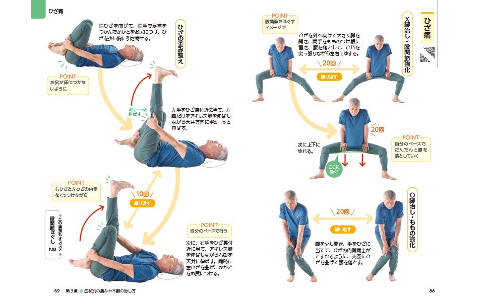 本書では、腰痛、坐骨神経痛、脊柱管狭窄症、ひざ痛、足首・肩・首・ひじ・手・指などの痛みなど、13の症状別の自力整体も紹介しています。