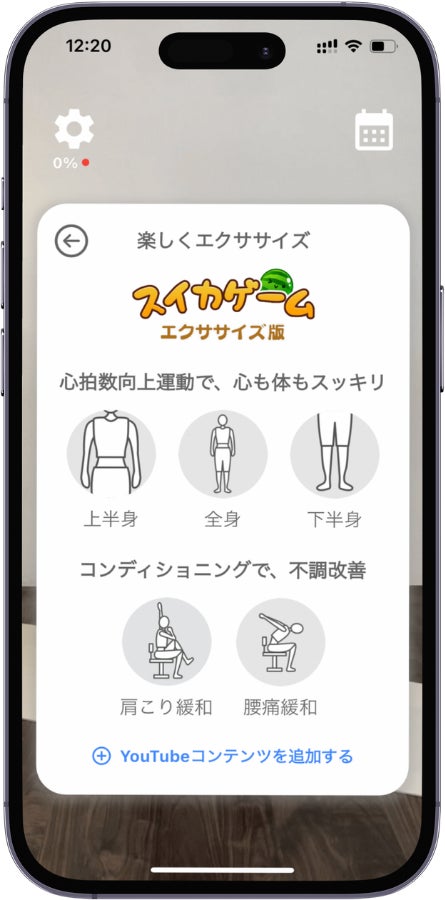 エクササイズメニューには、AIがユーザーの好みや状況に応じてエクササイズメニューを提供するガイド機能も備えており、肩こりや腰痛などの不調を緩和するサポートも行います。また、「スイカゲーム エクササイズ版」や「YouTube連携機能」など、楽しみながらエクササイズを行う機能も多数搭載しています。