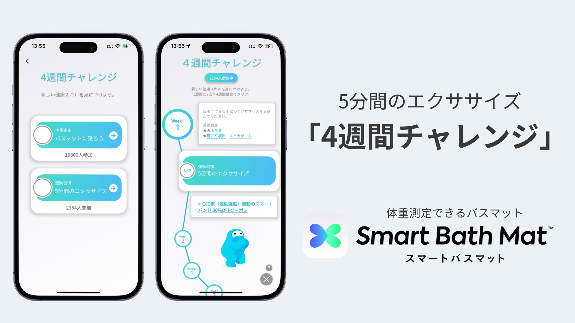このたび、issinが提供する体重測定できるバスマット「スマートバスマット」専用アプリ内の機能「4週間チャレンジ」では、「Smart 5min」を使用した5分間のエクササイズモードを追加しました。