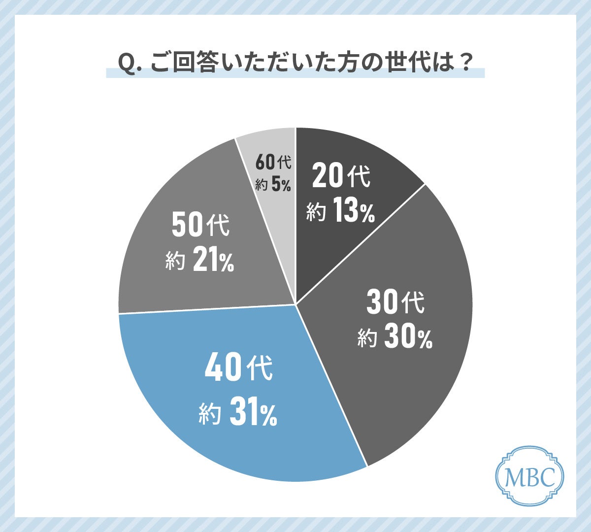 「回答者の年齢をお答えください」とアンケート調査した結果、40代(31%)、30代(30%)、50代(21%)、20代(13%)、60代(5%)でした。