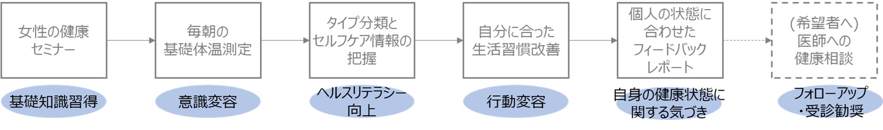 2023年10月、155名を対象にヘルスリテラシー向上を目的とした女性の健康セミナーを開催し、実証実験の開始前後にアンケートを行いました。91名が3カ月間継続して「オムロン 婦人用電子体温計MC-652LC」で基礎体温を測定しました。また、ワコール社が提供する女性の揺らぎをととのえ、セルフケアを応援する情報サイト「YOJOY(ヨジョイ)」を活用し、自身で健康増進を図りました。その後、3カ月間測定した基礎体温データと月経周期から、個人の状態に合わせたフィードバックレポートとLIFEM社の法人向けフェムテックサービス「ルナルナ オフィス」を通じて、希望者にオンラインによる医師への健康相談の機会を提供しました。