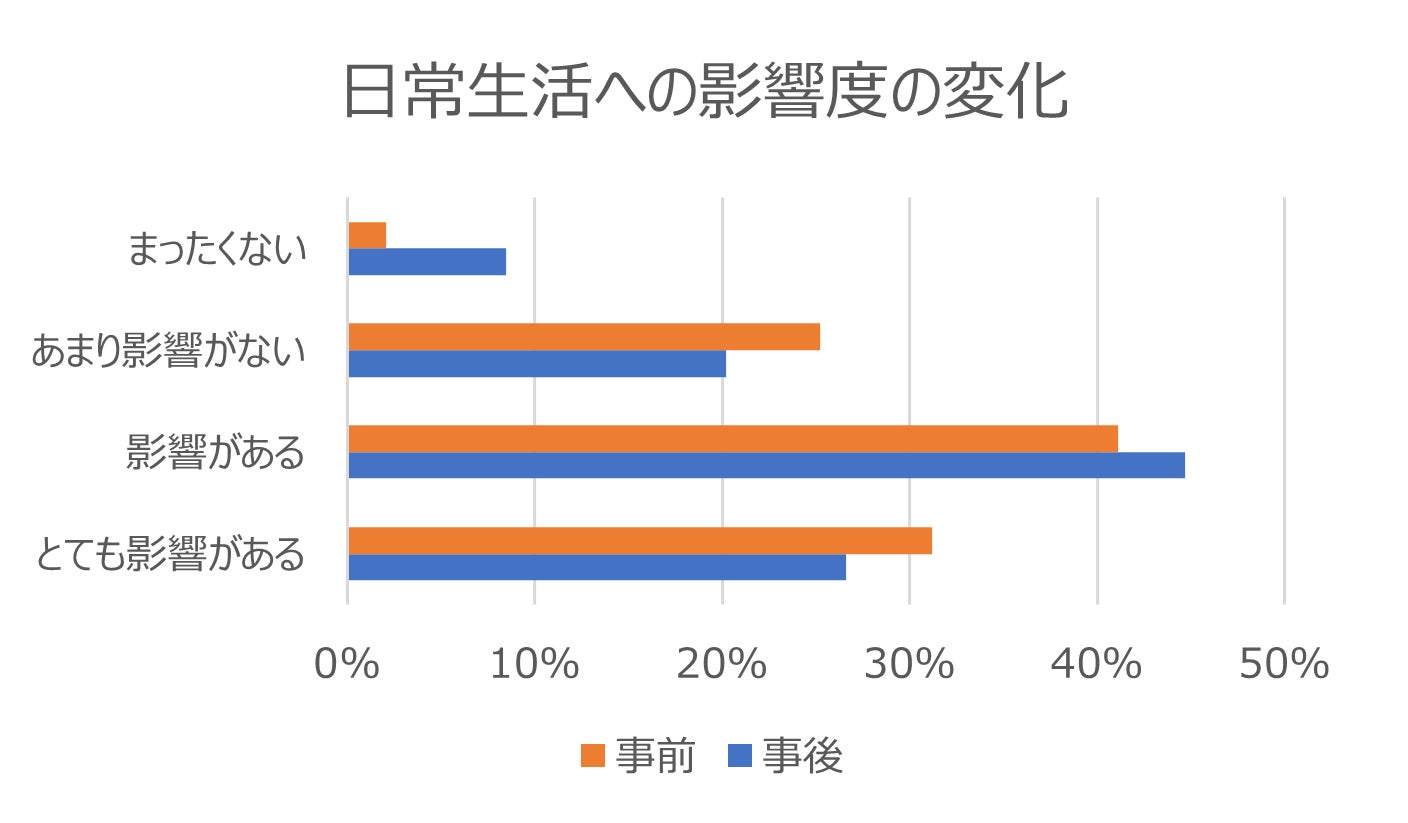 月経による不調の日常生活への影響度は、「とても影響がある」人の割合が5%減少すると共に、「全くない」人の割合が5%増加しました。