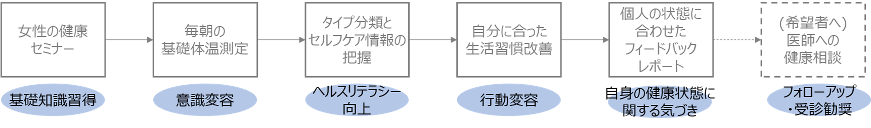 2023年10月、155名を対象にヘルスリテラシー向上を目的とした女性の健康セミナーを開催し、実証実験の開始前後にアンケートを行いました。91名が3カ月間継続して「オムロン 婦人用電子体温計MC-652LC」で基礎体温を測定しました。また、ワコール社が提供する女性の揺らぎをととのえ、セルフケアを応援する情報サイト「YOJOY(ヨジョイ)」を活用し、自身で健康増進を図りました。その後、3カ月間測定した基礎体温データと月経周期から、個人の状態に合わせたフィードバックレポートとLIFEM社の法人向けフェムテックサービス「ルナルナ オフィス」を通じて、希望者にオンラインによる医師への健康相談の機会を提供しました。