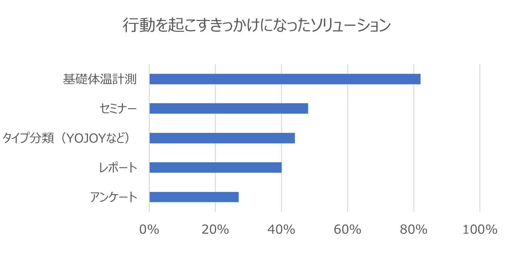 自分の健康や体調への意識が変わったり、関心が高まったり、行動を起こすきっかけになったものとして、基礎体温計測と回答した人が82%で最も多く、次いでセミナーが48%、養生*1の考えをベースにしたからだとこころのタイプ分類(YojoCheck)が44%と続きました。また、基礎体温計に関しては81%が今後も継続して利用したいと回答。
