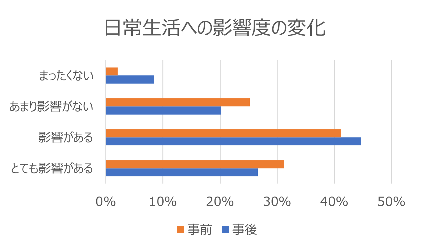月経による不調の日常生活への影響度は、「とても影響がある」人の割合が5%減少すると共に、「全くない」人の割合が5%増加しました。