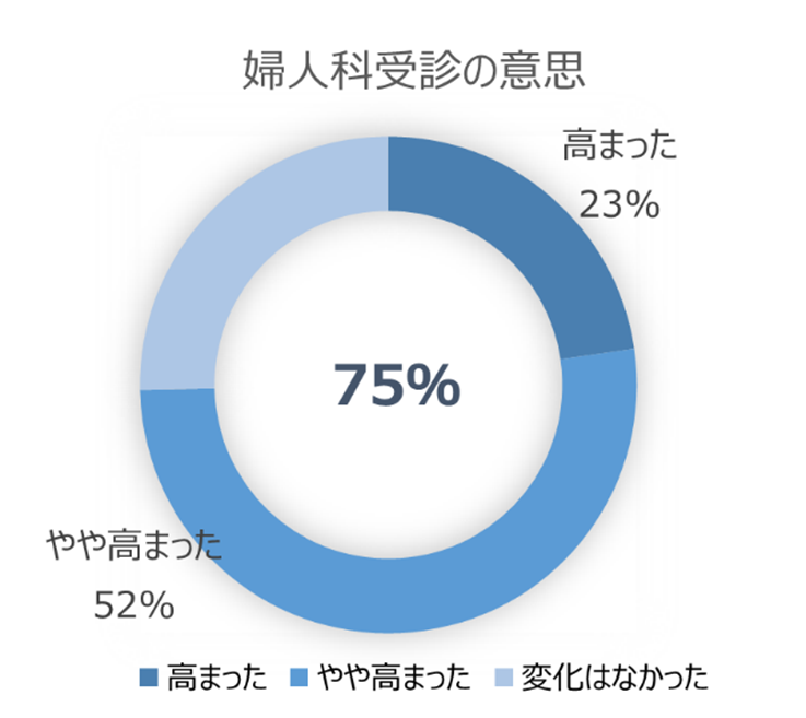 定期的に婦人科を受診していない女性は、終了時に75%の人が婦人科を受診しようとする気持ちが高まったと回答。なお、実証実験開始時のアンケートでは、月経に伴う症状が「とてもつらい」「ややつらい」と回答した人が全体の81%を占めた一方で、定期的に婦人科受診をしている人は17%に留まっていました。