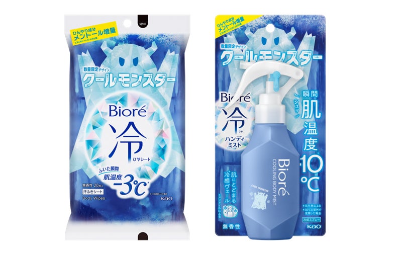肌をふいた瞬間に肌温度を3℃下げる*2 汗ふきシート『ビオレ 冷シート』と暑さが気になった瞬間にいつでもどこでもシュッとするだけで瞬間肌温度を10℃下げる*4 冷却ミスト「ビオレ 冷(ひや)ハンディミスト」からクールモンスターデザインを数量限定で発売。ひんやり成分のメントールを増量*1。