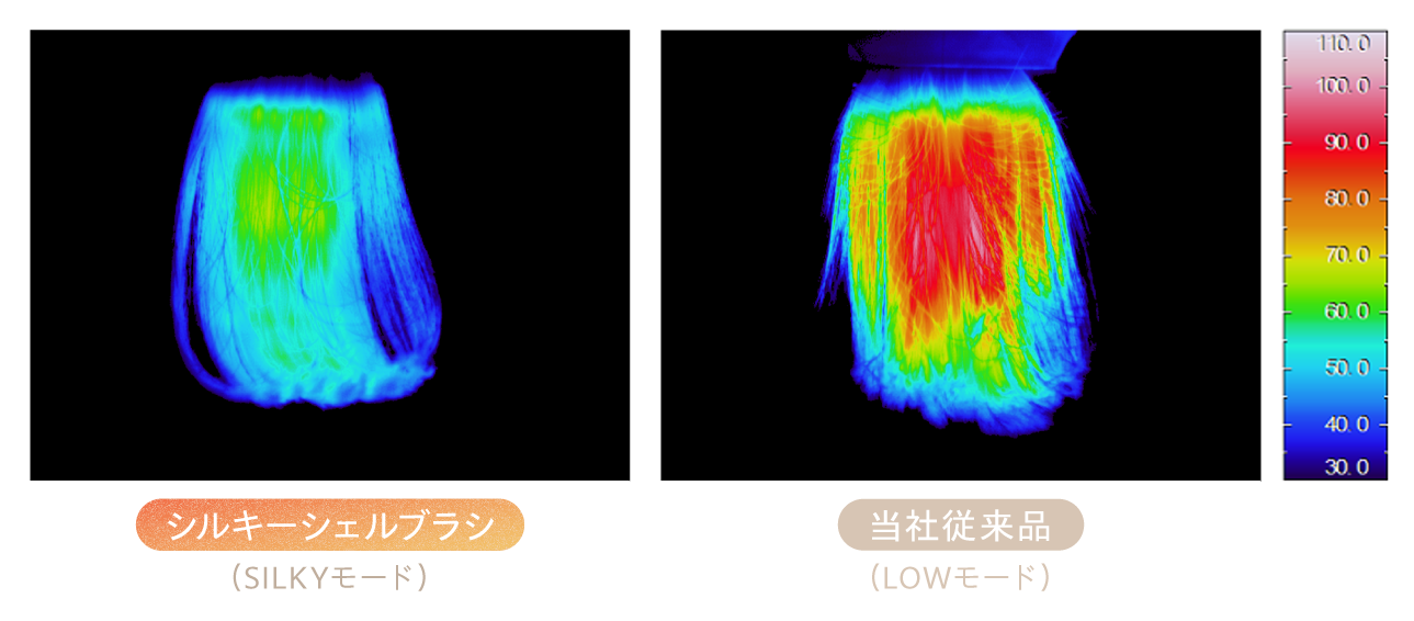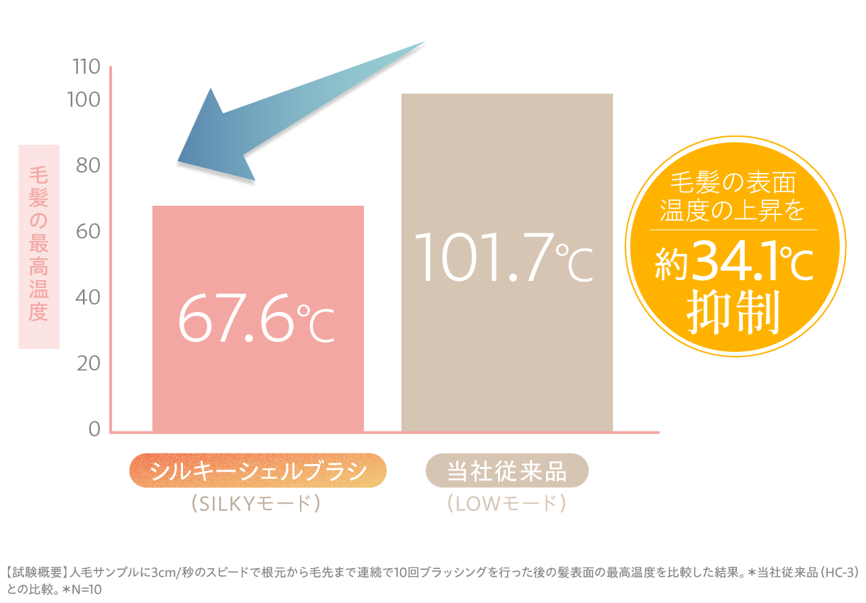”髪に熱を与えるとダメージになる”というイメージがありますが、ちょうどいい”温感”は髪にツヤ感とまとまり感を与えてくれます。一般的に、熱が髪のダメージとなるのは髪の温度が100℃を超え髪内部の水分が蒸発してしまうことが原因です。『シルキーシェルブラシ』は最高温度を140℃に設定し、髪自体の温度を100℃以下に留める「シルキーソフトヒーター機能」で、髪内部の水分は守りながらツヤ感とまとまり感のみが得られるような温度設計を実現しました。さらに、静電気除去技術「シルキーイオンリセット機能」も搭載で、いつでもどこでも指通りのなめらかなさらさらヘアが叶います。