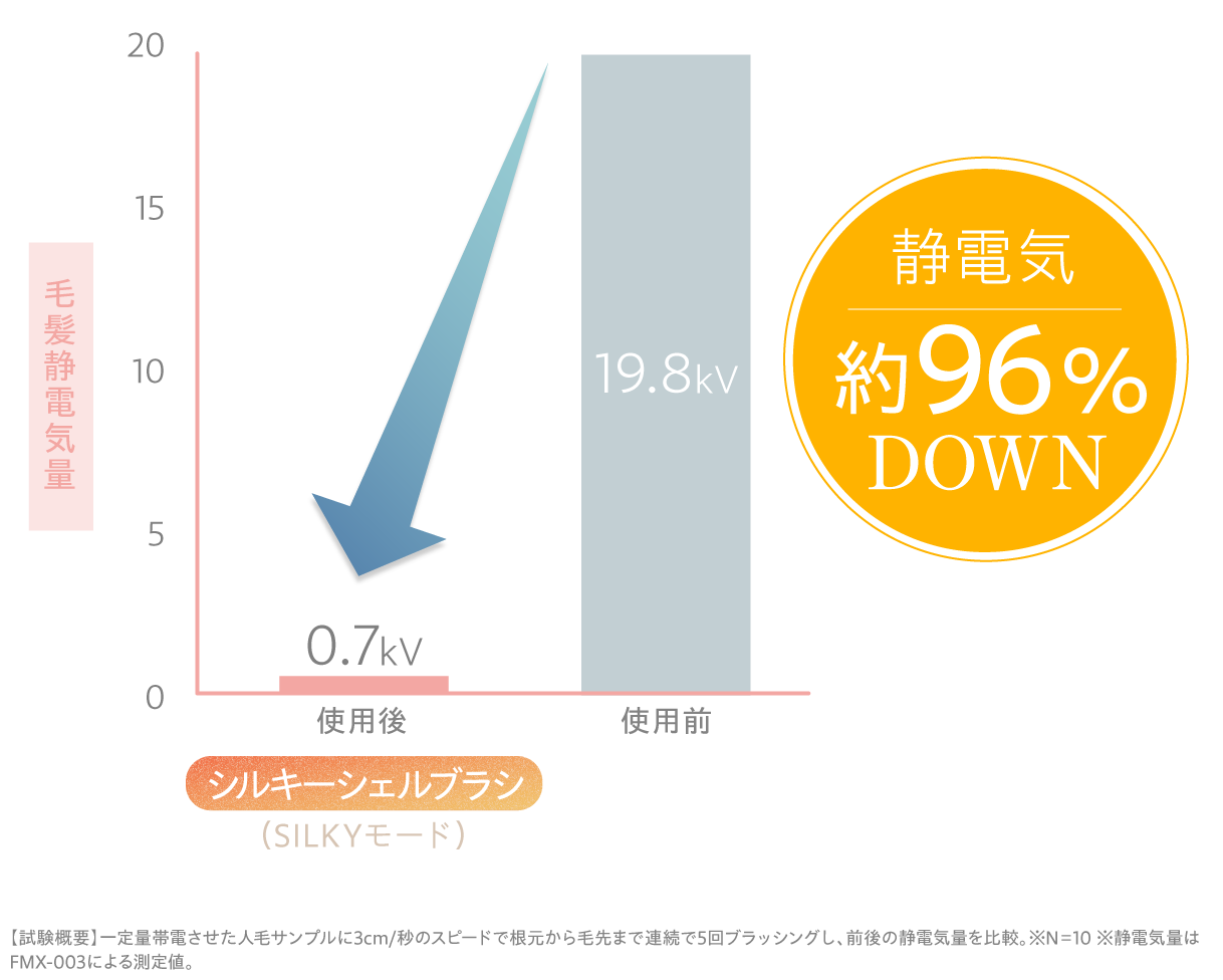 小型でありながら、ヤーマン史上最高*³レベルのイオン*²量でしっかりと静電気を除去し、静電気ダメージから髪を守ります。その静電気除去効果は『シルキーシェルブラシ』を使用する前に比べて静電気を約96%カットです。
