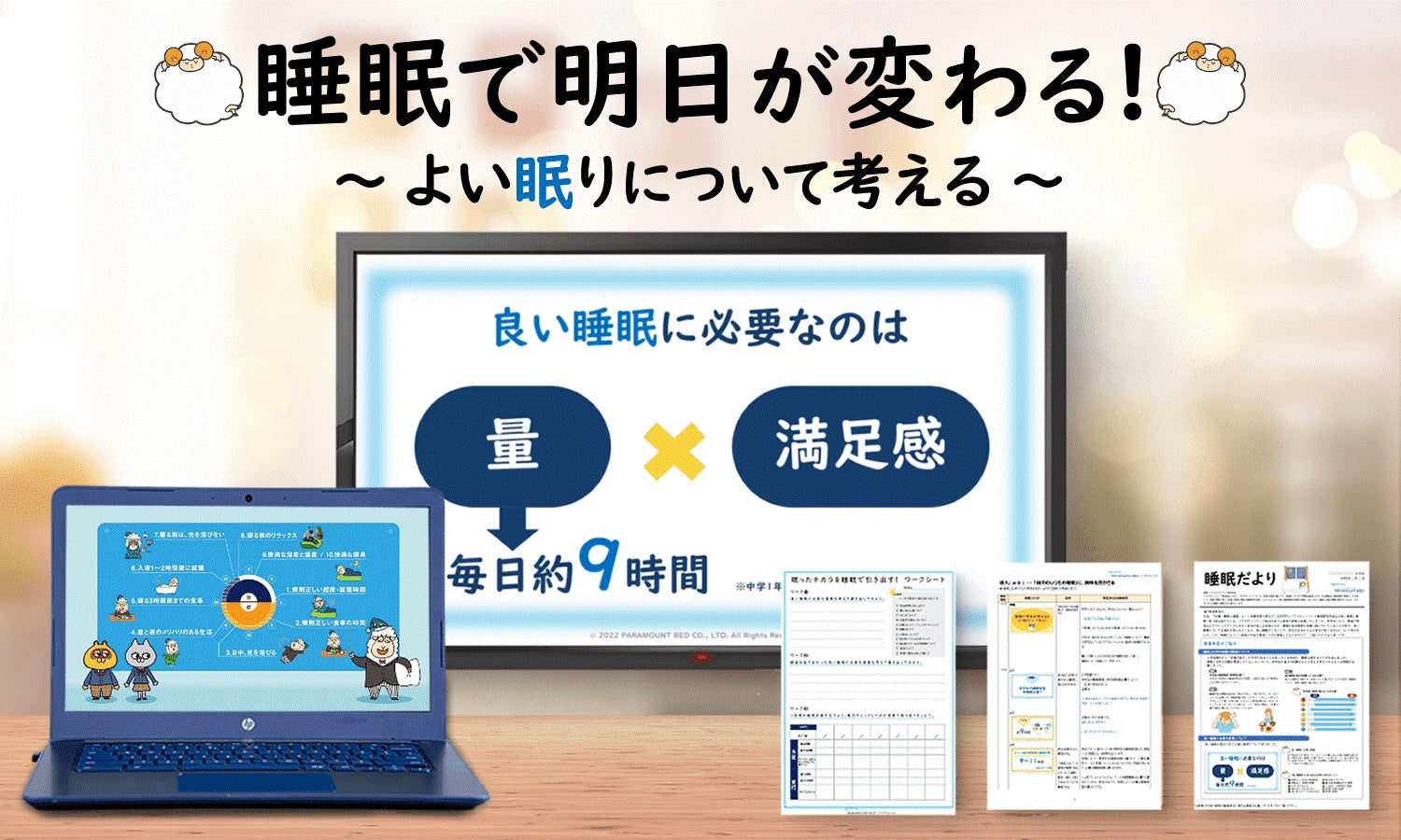 パラマウントベッド株式会社(東京都江東区、代表取締役 社長執行役員:木村友彦)は全国の中学生に向けて、「睡眠」の大切さを学ぶ教育プログラムの提供を今年度も実施します。本教材は、教員向け教材を開発、提供する株式会社ARROWS(本社:東京都中央区、代表取締役社長:浅谷 治希 以下「ARROWS」)と共に、生徒たちが自身の睡眠に興味を持ち、重要性に気づくことを目的に共同で制作したものです。2022年6月より無料配布を開始し大変好評をいただいた他、授業後に行った調査結果から、睡眠の重要性への理解、よりよい睡眠習慣の創出に貢献していることが分かり、2022年、2023年に引き続き2024年においても提供することを決定しました。