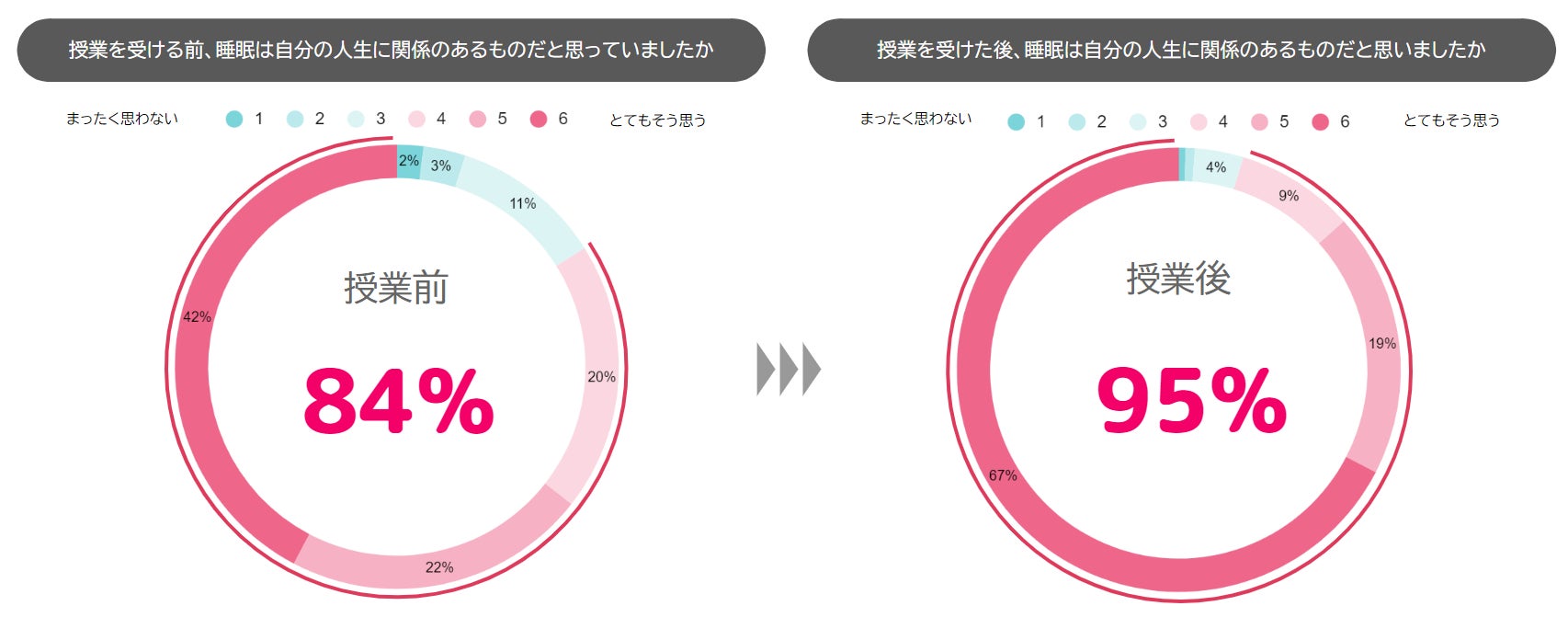 人生における「睡眠」の重要性の理解や、規則正しい生活への行動変容意向が強く表れています。