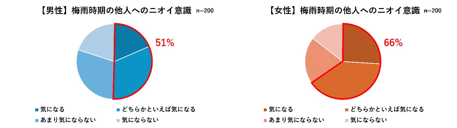 関東における2024年の梅雨入りは6月上旬と予想されています(日本気象協会調べ)。まもなく梅雨入りにあたり、ニオイケアに関するアンケート調査を実施したところ、男性50%、女性57%と男女どちらも半数以上が自身の梅雨時期のニオイを気にしていることがわかりました。また、梅雨時期の他人へのニオイ意識は「気になる・どちらかと言えば気になる」と回答した人が男性51%、女性が66%と「自身のニオイ」に比べ「他人のニオイ」に対してより敏感になっていることがわかります。