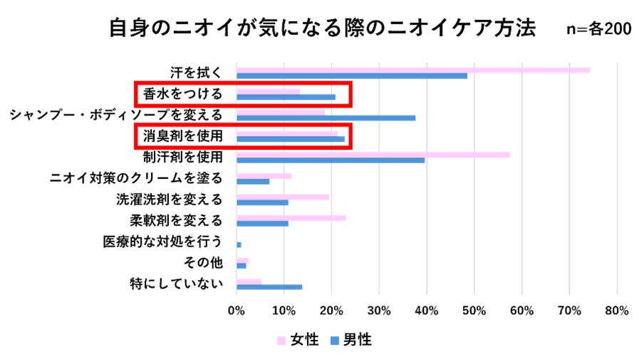 男性の行っているニオイケアの中で、女性に比べ多かったのが「香水をつける・消臭剤をつける」となっており、汗や衣服のニオイの上から「香り」を重ねてケアすることが多いようです。