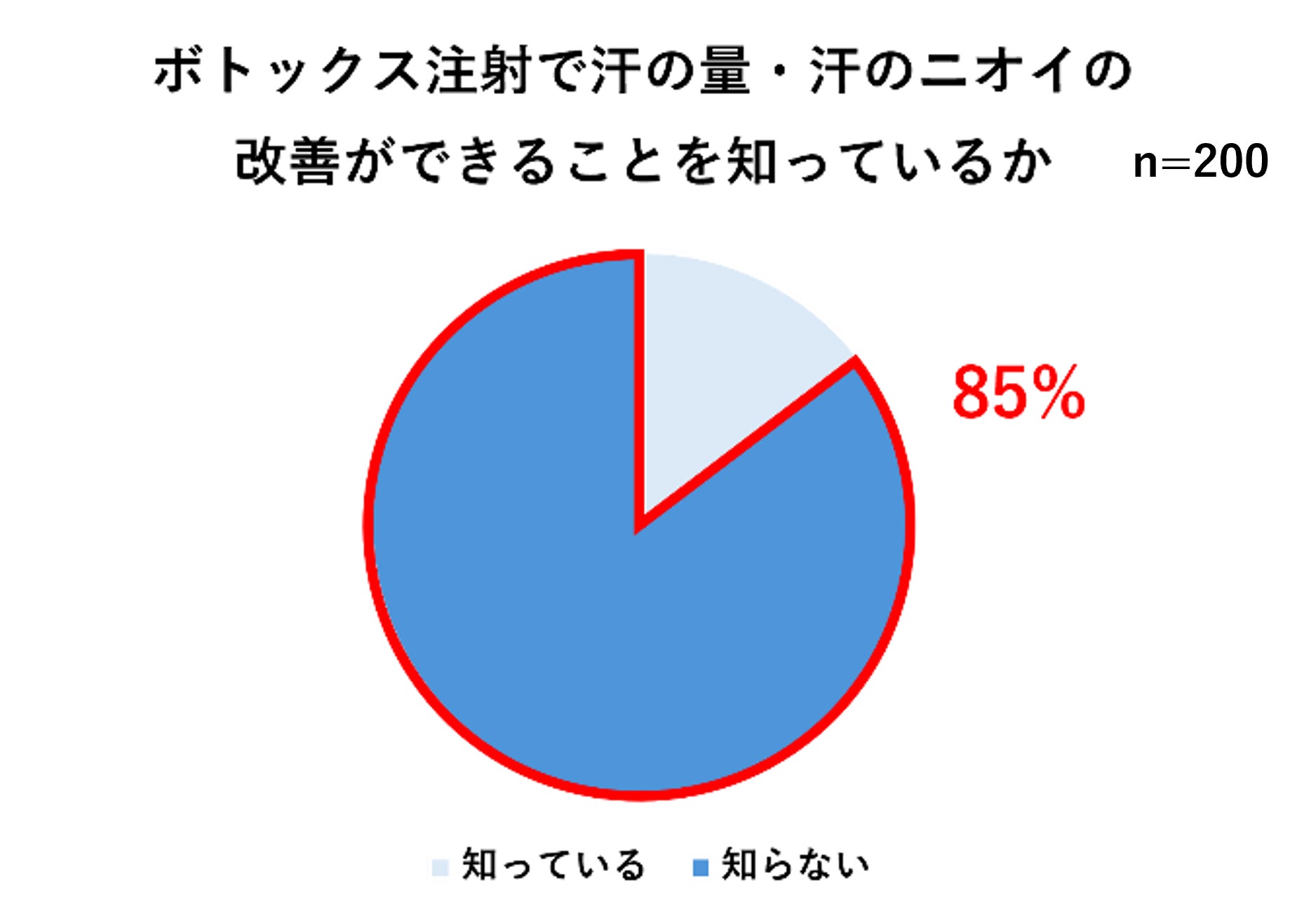 男性は自身のニオイ対策として「医療的な対処を行う」と回答した人が1%となっており、ほとんど行われていないことがわかりました。医療的な対処法としてはボトックス注射などがあります。脇汗の量や汗のニオイを抑える効果があり、防臭効果が持続することがメリットとして挙げられます。しかし、ボトックス注射への認知度は15%と低いことから、施術する方が少ないと考えられます。