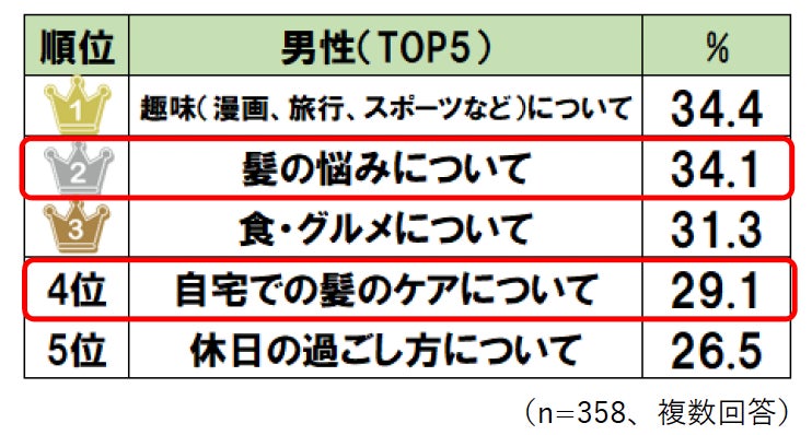 美容師との会話で楽しかった/役に立った話題では、「髪の悩み」「自宅での髪のケア」が男女とも上位にランクイン。「髪の癖を抑える方法」「自分に合った普段の髪の乾かし方」(自由回答より)など髪のプロならではの情報提供を求めている人が多いことが分かります。