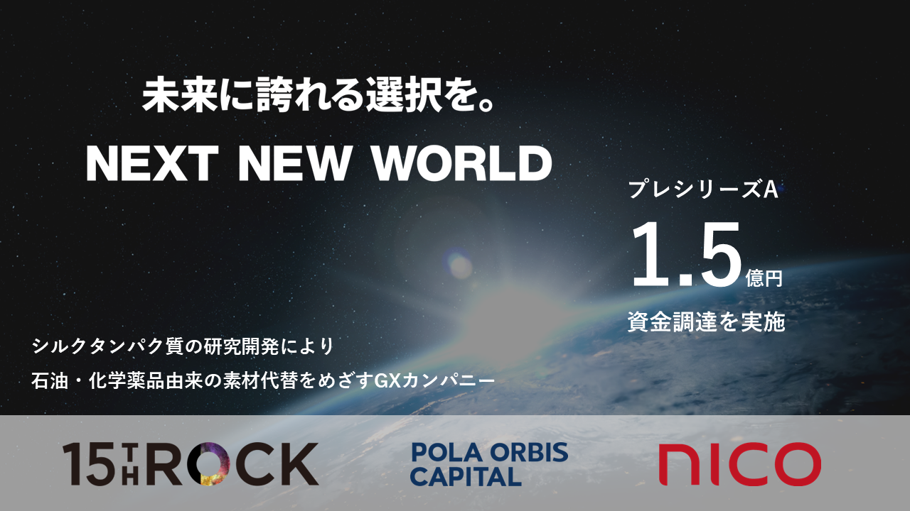NEXT NEW WORLD 社のプレシリーズAラウンドに参加させていただき、大変光栄に存じます。 サステナビリティへの関心が高まり、研究技術が進歩するなか、シルクの活用性はますます世界的に注目を浴びるのではないかと考えております。 このような時流に早くから注目し、独自の研究開発を推進してこられた代表 高嶋さんの行動力と、「未来に誇れる選択を」という強い使命感に、私たちは大変魅了されました。 今後の更なる成長に向け、