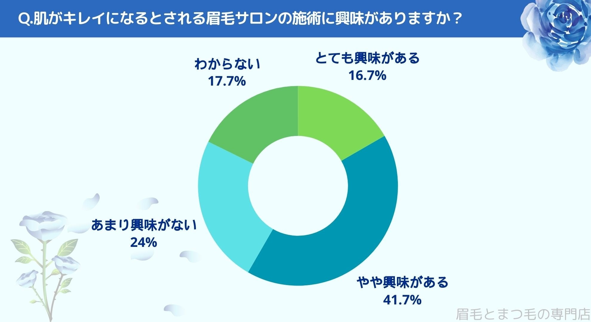 肌がキレイになるとされる眉毛サロンの施術に興味があるかお聞きしたところ「とても興味がある(16.7%)」、「やや興味がある(41.7%)」、「あまり興味がない(24%)」、「わからない(17.7%)」という結果になりました。