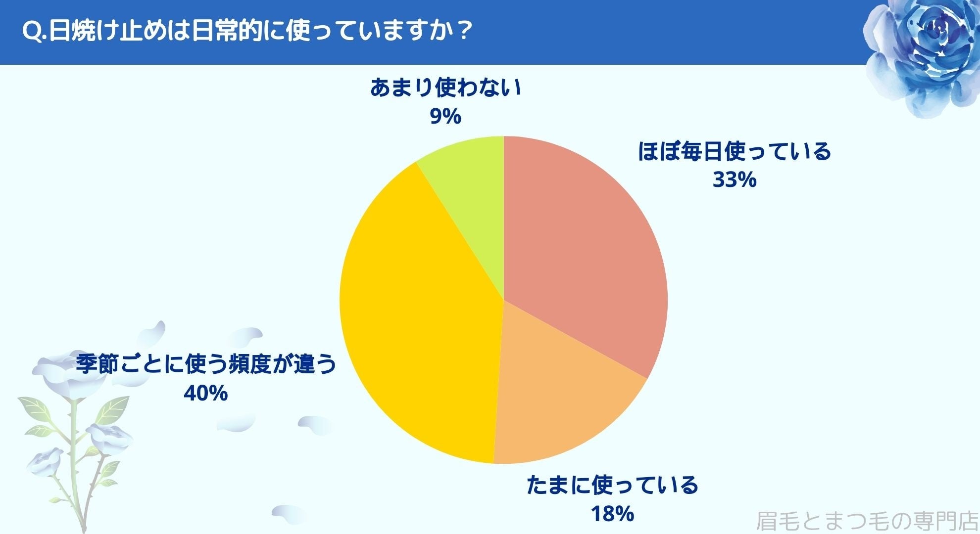 日焼け止めを日常的に使っているかお聞きしたところ「ほぼ毎日使っている(33%)」、「たまに使っている(18%)」、「季節ごとに使う頻度が違う(40%)」、「あまり使わない(9%)」という結果になりました。