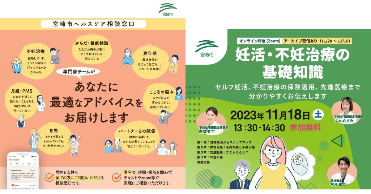 妊活・不妊治療についてだけではなく、不育症、夫婦間のコミュニケーション、性の問題などの妊活に関する相談に加え、月経トラブル、更年期、メンタルヘルス等ライフステージに応じた幅広い相談に対応しています。また、当事者としての悩みだけでなく、周囲の支える側としての相談も可能です。相談内容は宮崎市には共有はされませんので、性別や年齢問わず、どなたでも安心して気軽に利用できる事業としてサポートを行っていきます。
