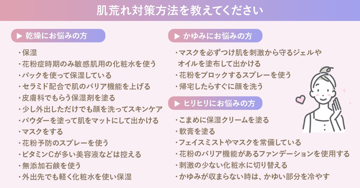 美容感度が高いアンケート回答者の多くが花粉症時期のトラブルに乾燥とかゆみと回答!。お悩みに対してどんな対策をしているか、花粉症時期のスペシャルケアや対策について調査しました。