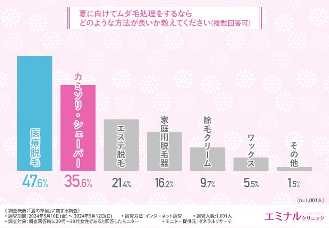 「夏に向けてムダ毛処理をするならどのような方法が良いか教えてください(複数回答可)」と質問したところ、『医療脱毛(47.6%)』と回答した方が最も多く、次いで『カミソリ・シェーバー(35.6%)』と続きました。