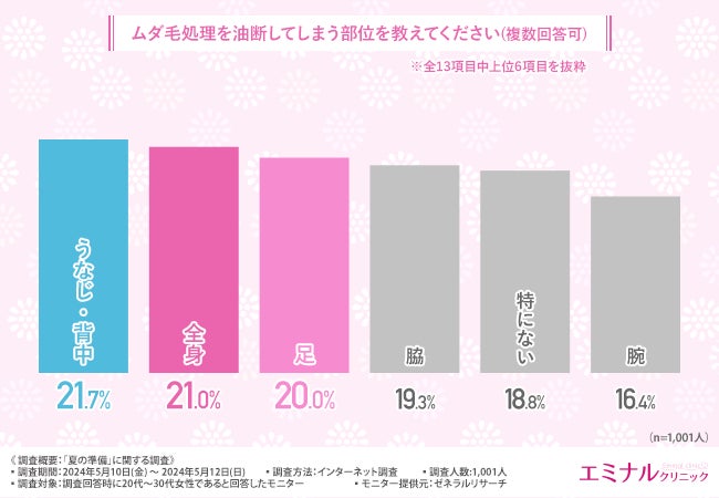 「ムダ毛処理を油断してしまう部位を教えてください(複数回答可)」と質問したところ、『うなじ・背中(21.7%)』と回答した方が最も多く、次いで『全身(21.0%)』『足(20.0%)』と続きました。