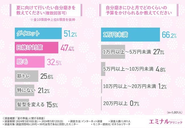今回の調査で、夏に向けて準備したいことTOP3は「ダイエット」「日焼け対策」「脱毛」であることが明らかになりました。薄着になったり肌の露出が増えたりすることが主な理由に挙げられています。自分磨きにひと月でどのくらいの予算をかけられるかについては、約7割が1万円未満と回答しました。月に1万円は自分磨きのための必要経費と考える女性が多いのかもしれません。