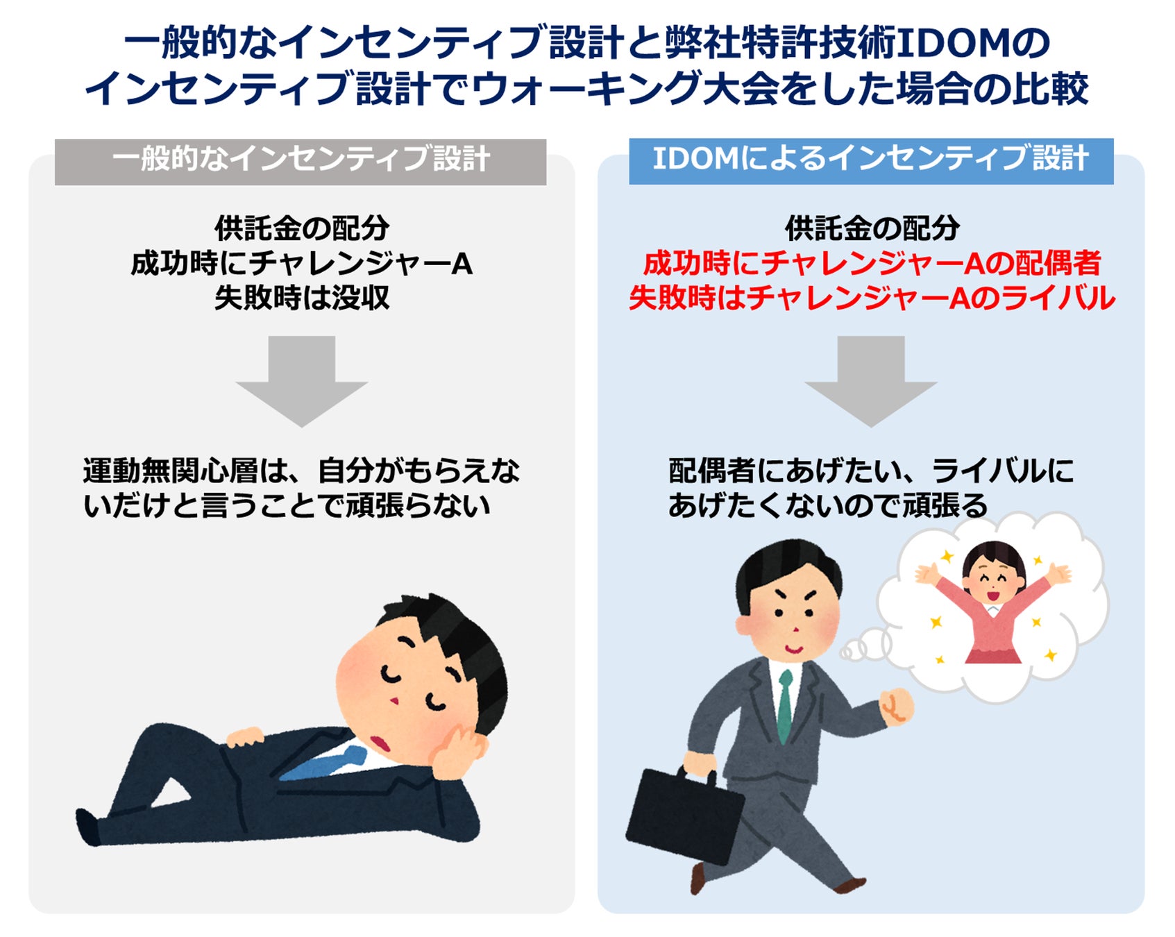 一般的なインセンティブ設計によるウォーキング大会では、運動無関心層のAさんが歩くか否かについては、Aさんがインセンティブを貰いたいか否かに限定され、運動に無関心なAさんは歩かなかったら自分がインセンティブをもらえないというだけで、頑張って歩こうとしません。一方で、当社特許技術IDOM*1を活用したインセンティブ設計によるウォーキング大会では、Aさんは配偶者の為にも歩こうという気持ちと、失敗するとライバルにインセンティブが渡ってしまうということは避けたいという気持ちが促されるため、Aさんは意欲的にチャレンジ成功に向かって歩くことができます。