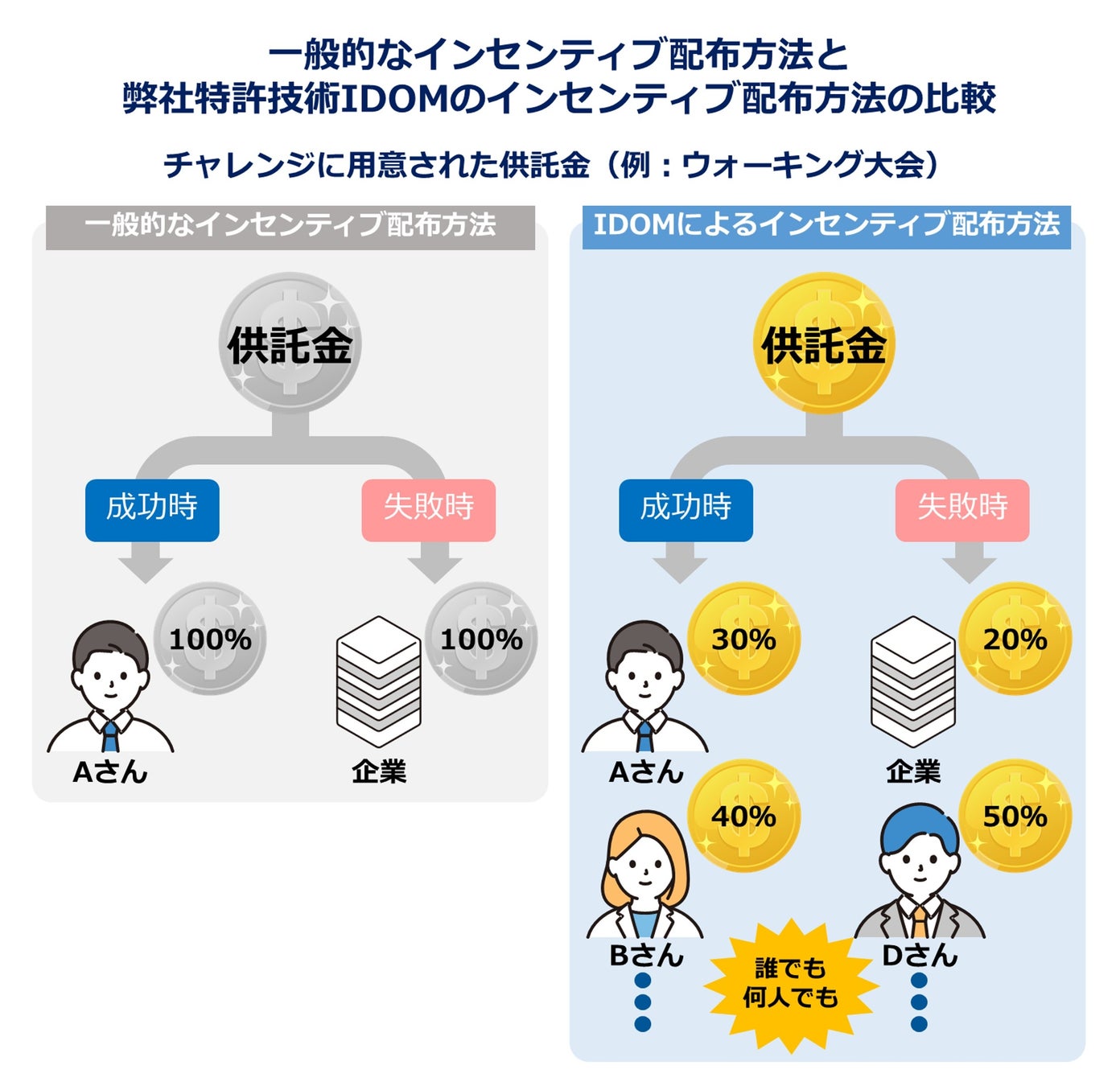 一方、当社特許技術IDOM*1のインセンティブ配布方法の場合、企業がスポンサーとなり、参加者Aさんがチャレンジに成功するとインセンティブがAさんだけではなくBさん(Aさんと仲が良い同僚)にも配布され、チャレンジに失敗すると企業にインセンティブが回収されるだけではなく、Dさん(Aさんのライバルの同僚)にインセンティブが配布される仕組みです。