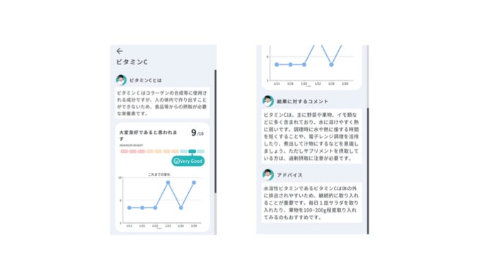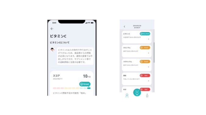 また、主に直近の食事状況による栄養状態を測定し、「普段の食事で栄養が足りているか」、「サプリメントを飲んでいるが栄養を摂れているか」といった日常生活の中でのお悩みや、「最近、なんだか調子が良くない」といった、ちょっとしたカラダの不調の原因を解決する手助けとなります。検査結果はアプリ内に保存されるので、生活改善後に再び検査をし、前の結果と比べることで、食事やサプリメント、運動の効果を確認することも可能です。毎日検査をすれば、日々の変化を見ることもできます。