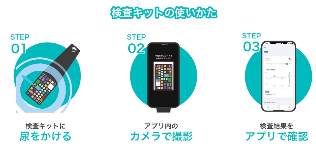 独⾃バイオマーカーの研究による解析・計測技術の開発、検出したデータを簡単にモニタリングできるスマートフォンアプリの開発、そして尿から解析した体の状態によって、