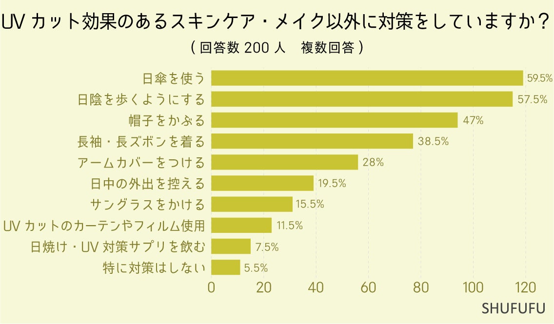 UVカット効果のあるスキンケア・メイク以外に対策をしているかでは「日傘を使う」が多数派でした。日傘を使うと紫外線対策だけではなく熱中症対策にもなるので有効活用したいですね。