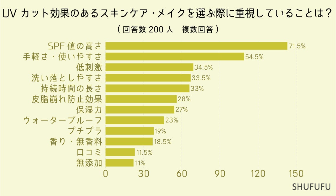 UVカット効果のあるスキンケア・メイクを選ぶ際に重視していることに関しては1位「SPF値の高さ(71.5%)」、2位「手軽さ・使いやすさ(54.5%)」でした。SPFとはUV−B(黒化につながりやすくなる紫外線)に対する防止効果を示すものなんだそう。数値が高ければ高いほど効果も高いそうですが、その分肌に負担をかけてしまうのでバランスが大事ですね。