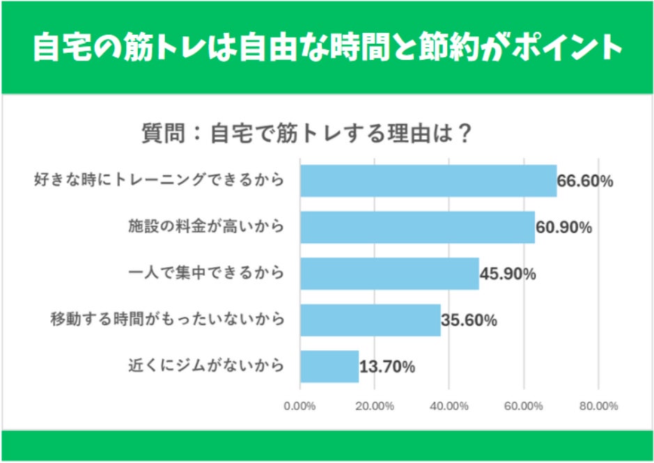 自宅での筋トレを選んだ理由で多かったのは「好きな時にトレーニングできるから」「施設の料金が高いから」が6割以上でした。