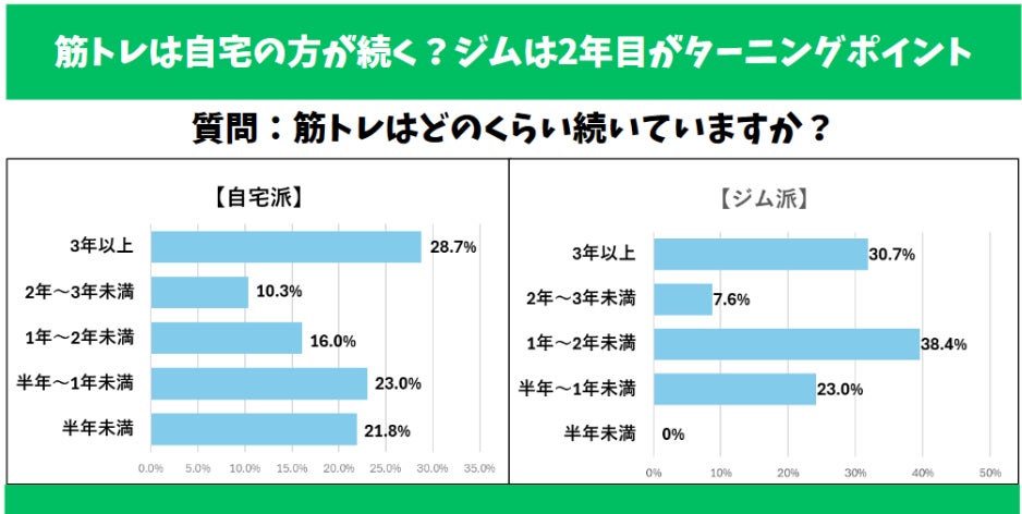 また、筋トレを2~3年継続しているという方は共通して少なく、特にジム派では7.6%と顕著に低くなっていました。
