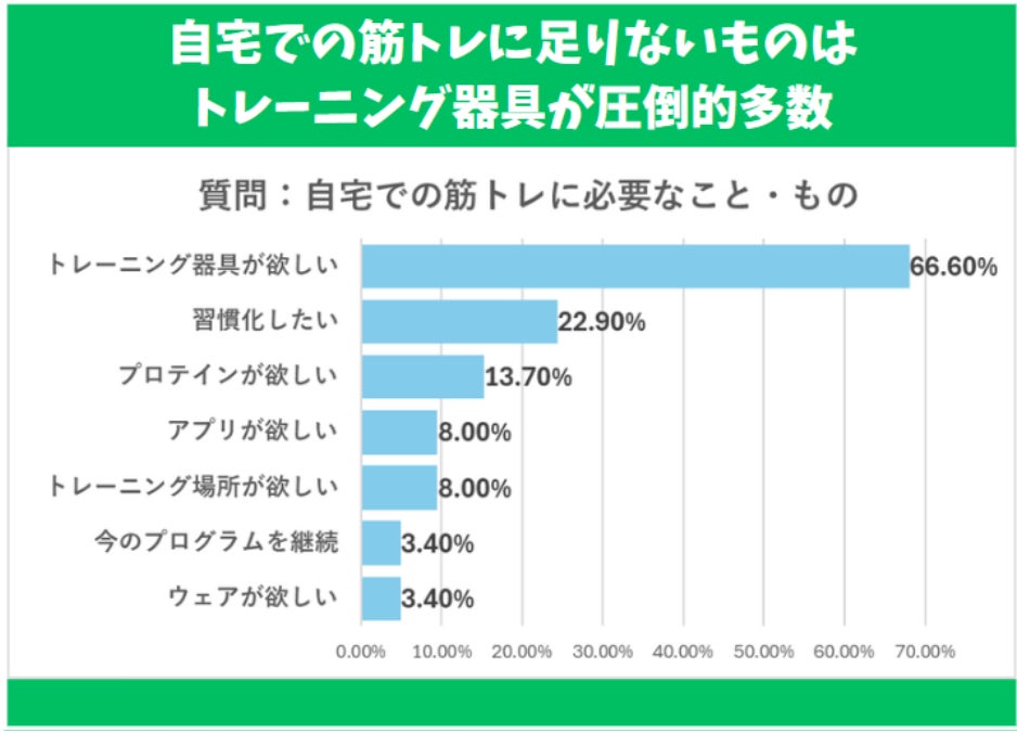 また、自宅での筋トレを選んでいる方が8割以上いる中で、トレーニング器具の不足はせっかくのやる気をそぐ原因になります。