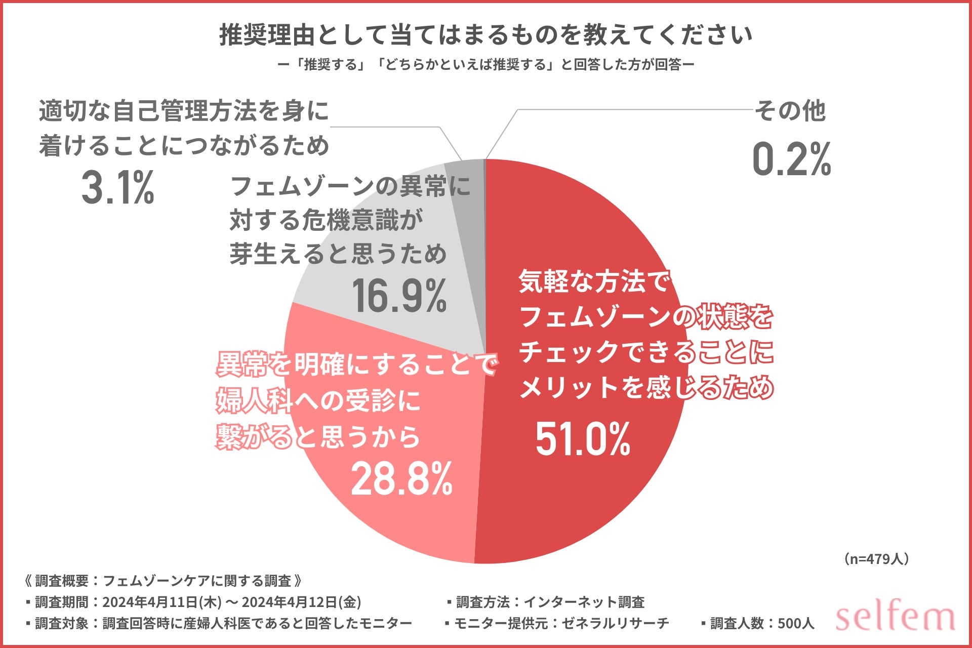 最後に、「推奨理由として当てはまるものを教えてください」と質問したところ、『気軽な方法でフェムゾーンの状態をチェックできることにメリットを感じるため(51.0%)』と回答した方が最も多く、次いで『異常を明確にすることで婦人科への受診に繋がると思うから(28.8%)』と続きました。