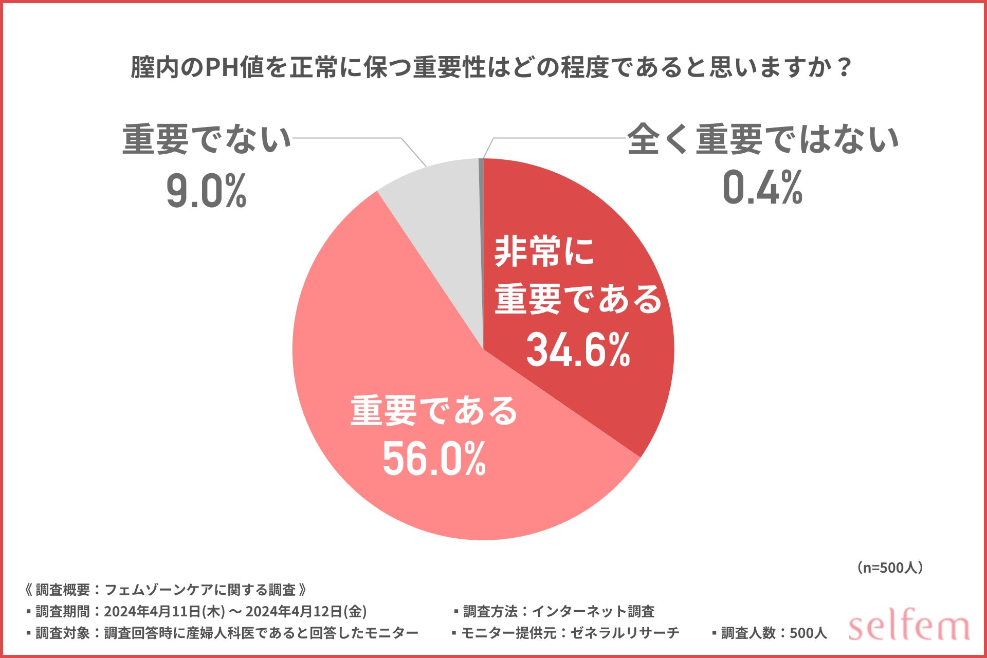 「膣内のPH値を正常に保つ重要性はどの程度であると思いますか?」と質問したところ、『非常に重要である(34.6%)』『重要である(56.0%)』『重要でない(9.0%)』『全く重要ではない(0.4%)』という回答結果になりました。