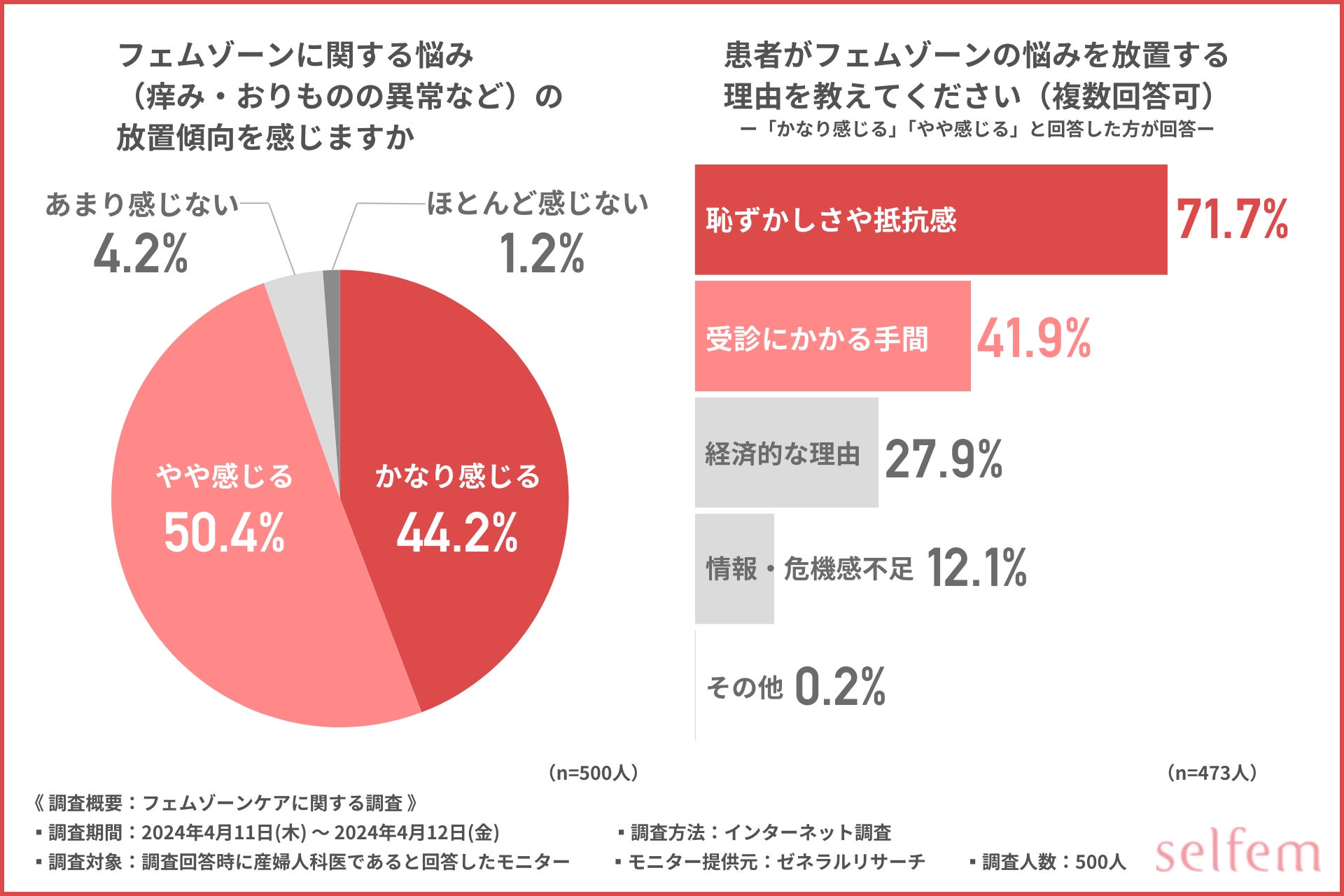 フェムゾーンの悩みを放置すると、日常生活に支障をきたす臭いや痒みだけでなく婦人病のリスクが高まったり、病気に気づくタイミングを失う可能性があることが示唆されました。