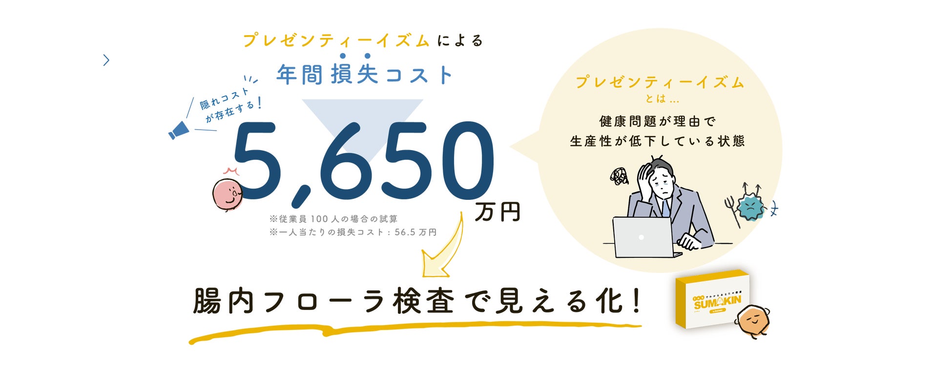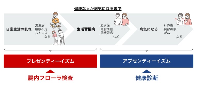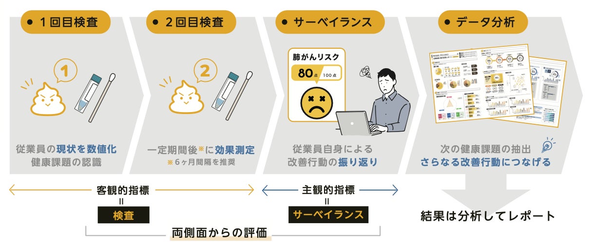 当サービスは、従業員の悩みに着目した従業員向けの腸内フローラ検査サービスです。健康診断とは異なり、病気になる前の不調(プレゼンティーイズム)を見える化します。