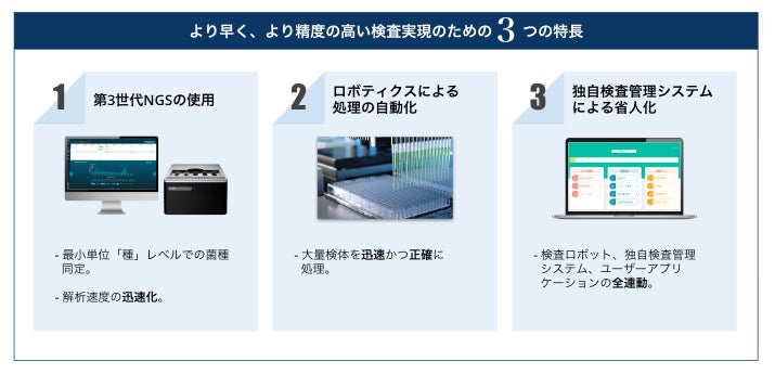 当検査では第3世代のNGSを用いているため、最小単位「種」レベルでの菌種同定が可能となります。また、解析速度が上がることにより、10営業日程度での検査結果の連携を実現しました。