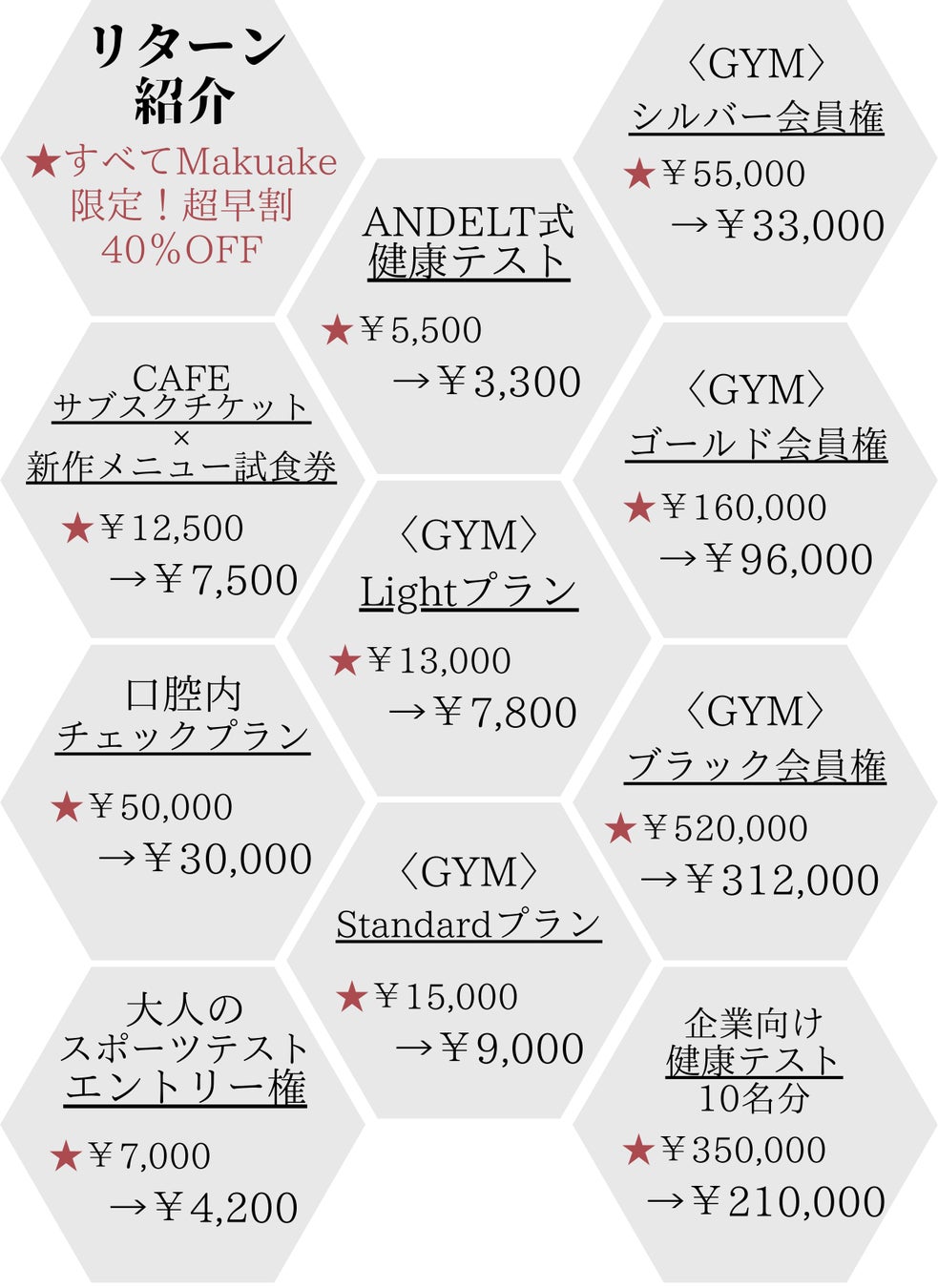 最先端健康施設の、Makuakeでしか手に入らない最先端健康施設の特別なプランを、なんと40%OFFで皆様にお届けします! 通常提供していない特別なサービスもご用意しましたので、一足早くぜひ体験してみてください!