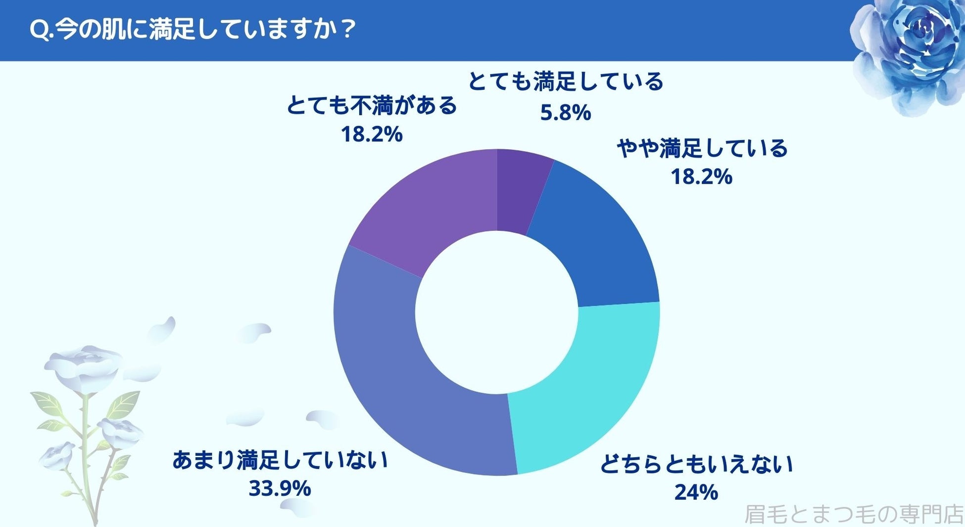 今の肌に満足しているかお聞きしたところ「とても満足している(5.8%)」、「やや満足している(18.2%)」、「どちらともいえない(24%)」、「あまり満足していない(33.9%)」という結果になりました。
