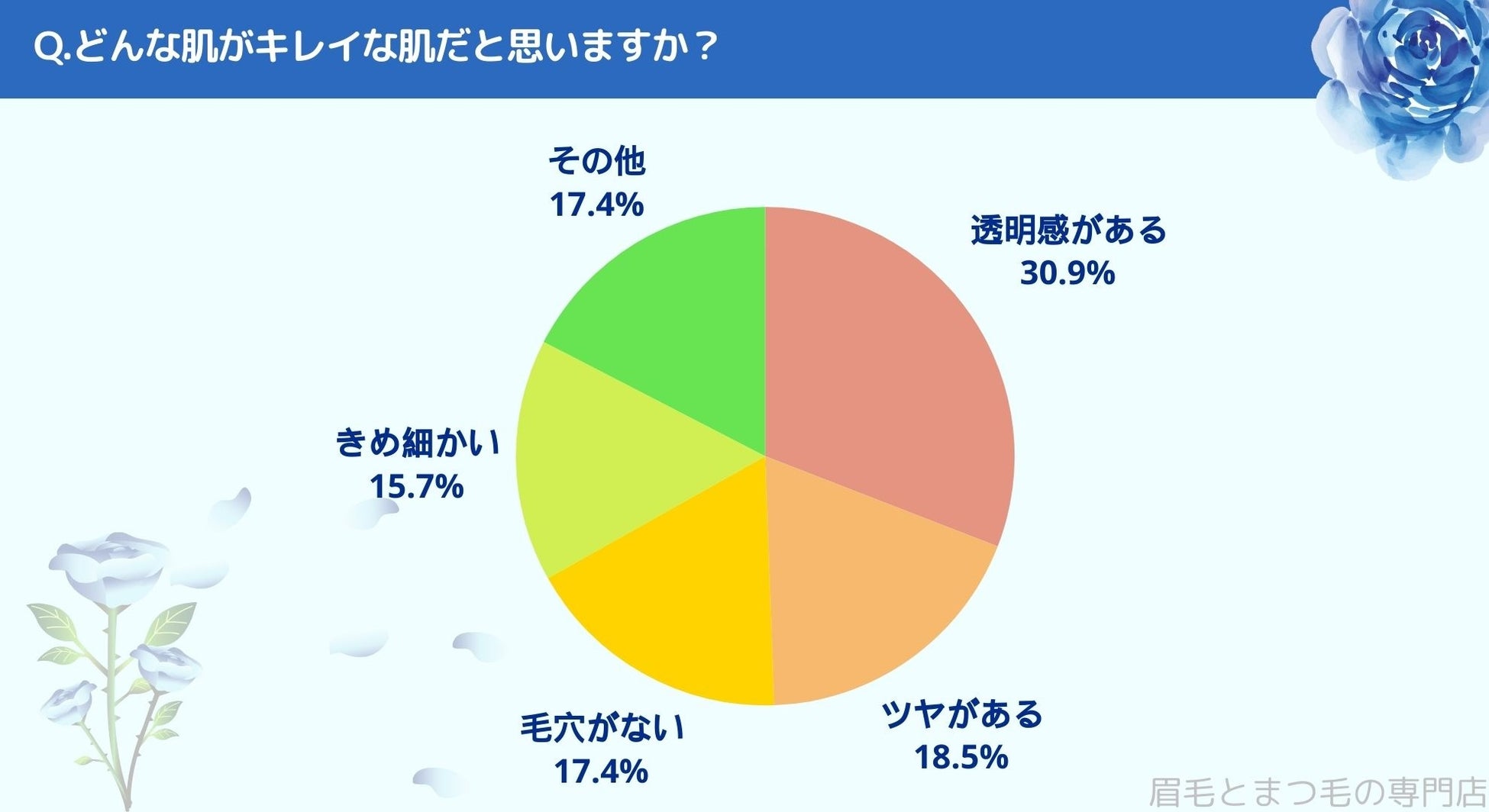 どんな肌がキレイな肌と思うかお聞きしたところ「透明感がある(30.9%)」、「ツヤがある(18.5%)」、「毛穴がない(17.4%)」、「きめ細かい(15.7%)」、「その他(17.4%)」という結果になりました。