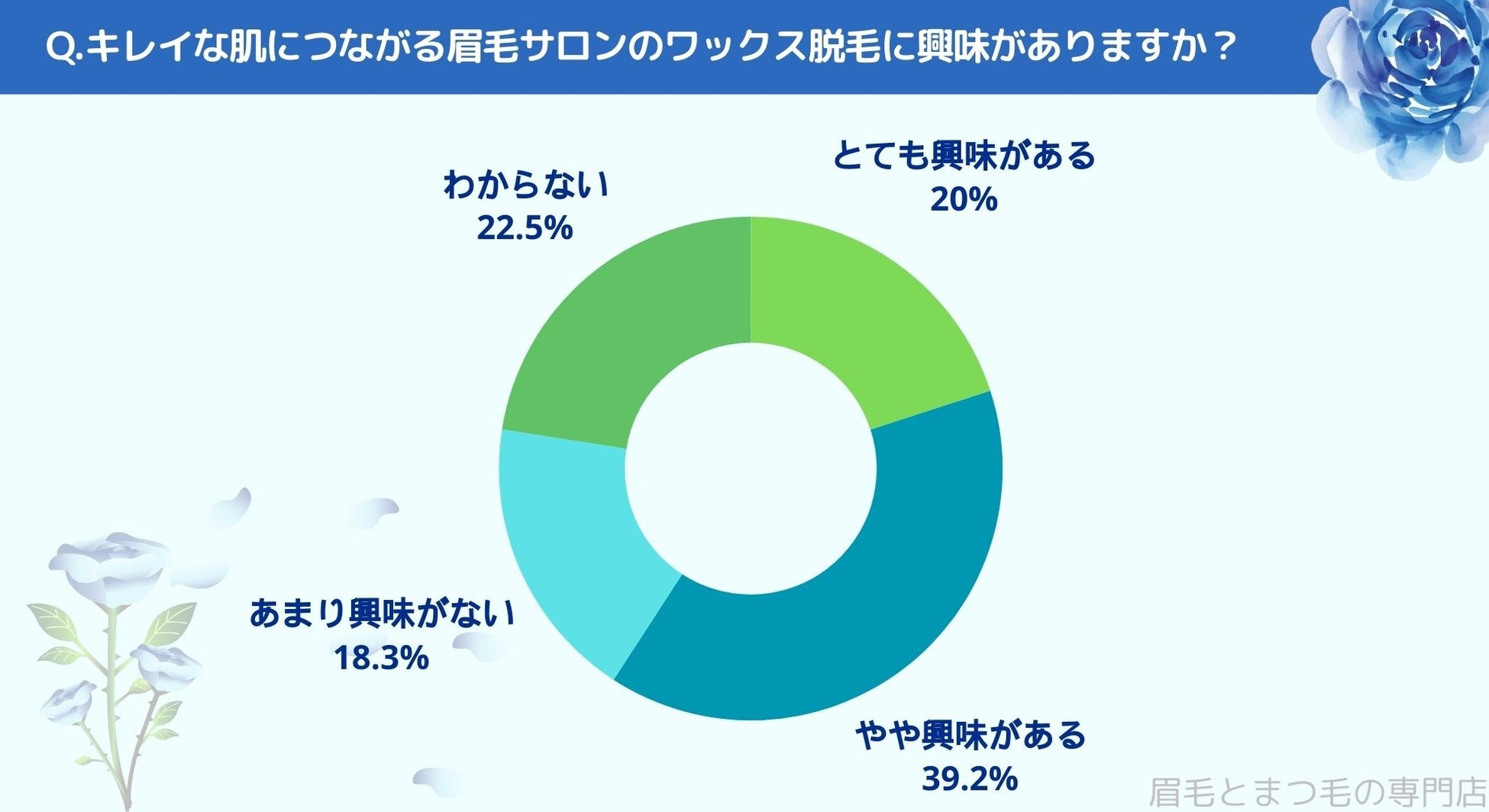キレイな肌につながる眉毛サロンのワックス脱毛に興味があるかお聞きしたところ「とても興味がある(20%)」、「やや興味がある(39.2%)」、「あまり興味がない(18.3%)」、「わからない(22.5%)」という結果になりました。