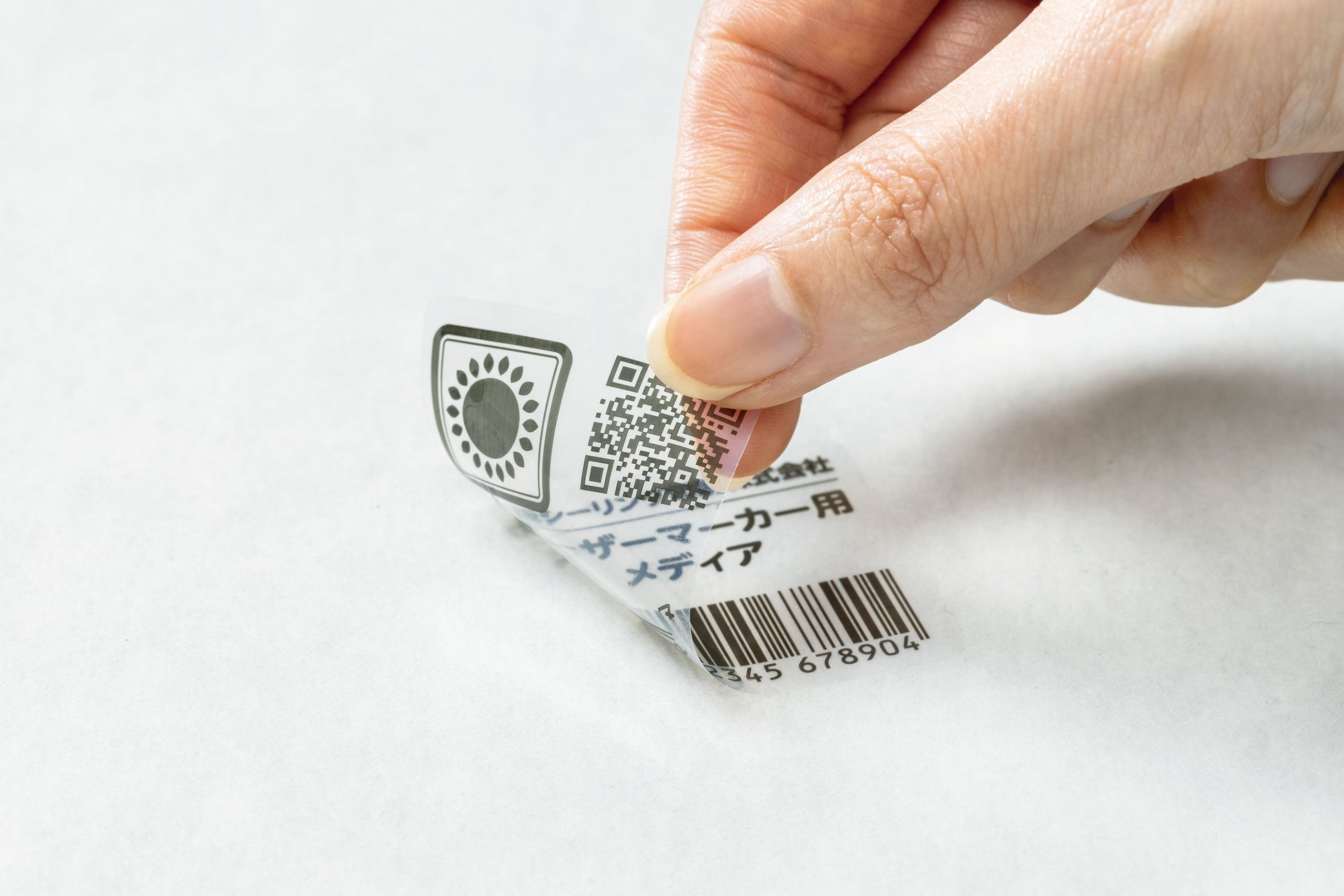 大阪シーリング印刷が2014年に発売した「クリアサーマルフィルム(以下、参照ください)」の塗工技術や軟包材加工のラミネート技術を活かし、使用する接着剤・粘着剤と発色剤の組み合わせを最適化することで成功に至りました。本製品は多層構造になっており、UVレーザーを照射する最表層に発色層がないため、クリアな印字仕上がりでこすっても消えにくく水や油に強いことが特長です。また、和紙風のレーヨンやマットフィルムなどの表面に凹凸のあるメディアにも、きれいに印字することができます。さらに、インキや印刷版、またインクリボンも不使用のため印字の際に発生する消耗品がありません。