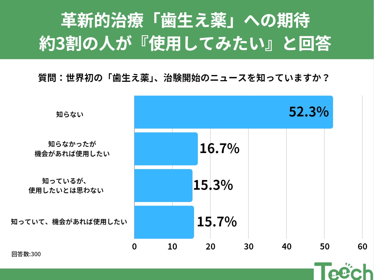 大阪市北区の北野病院とその研究チームが発表した、世界初の「歯生え薬」の治験開始のニュースが注目を集めています。20代から40代の男女にこの治験に関する意識調査を行いました。