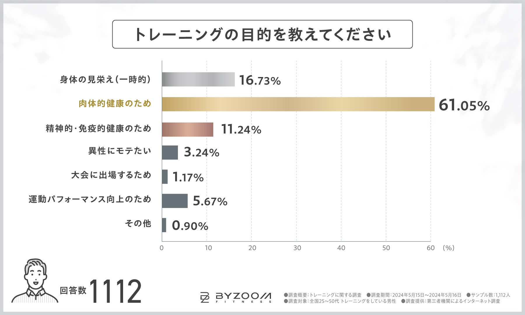 ホームフィットネスブランドとして世界中で愛される「アジャスタブルダンベル」をはじめとするホームジムグッズを取り扱う『BYZOOM FITNESS JAPAN』は、トレーニングをしている男性を対象に、トレーニングの目的や満足度に関する調査を実施しました。
