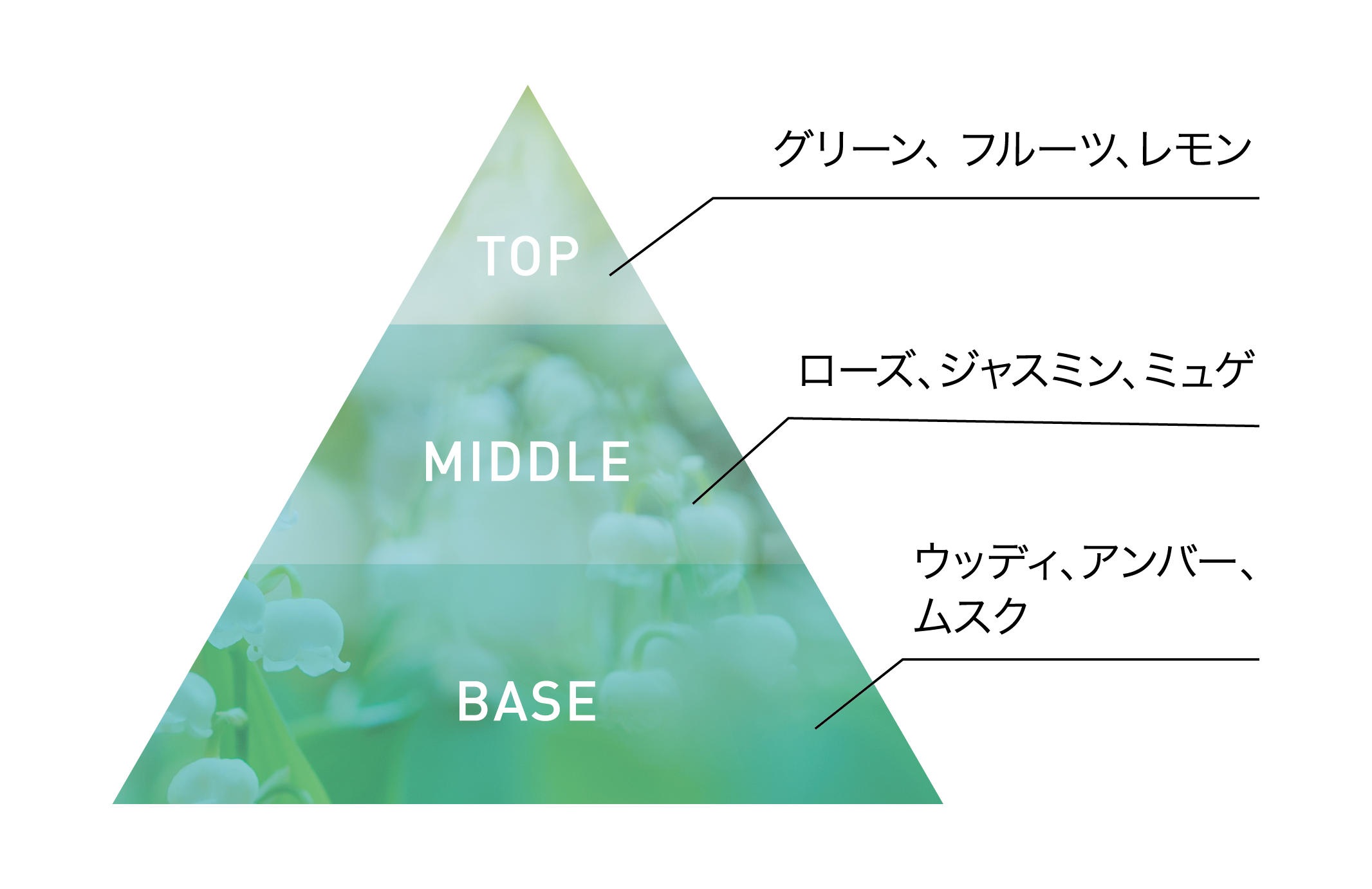 水辺に浮かぶ可憐な白い花をイメージして調香。ミュゲやジャスミンなど、白い花々に、フレッシュなフルーツを重ねて。透明感のある爽やかな香りが広がり、気分も明るくリフレッシュ。